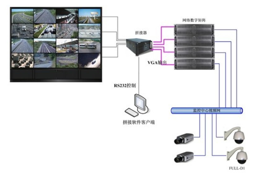 在監控中心我們設計采用一套46寸3*3的大屏拼接系統來顯示監控圖像。我們再后端配置4臺數字矩陣服務器,與拼接系統進行連接。虛擬數字矩陣每臺最高可支持8畫面高清720P或者4畫面1080P高清視頻圖像的分割顯示,通過數字矩陣服務器的顯卡VGA接口送至大屏幕拼接器后在拼接墻上進行顯示。
