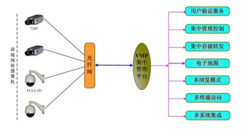 系統分為前端監控資源采集、視頻傳輸、后端平臺組建、多系統聯動建設等幾部分,整個系統采用全網絡數字視頻監控架構,前端都采用高清網絡攝像機進行視頻采集,通過攝像機的網絡端口直接接入到工廠視頻傳輸網絡中去,傳輸到后端進行集中存儲和管理。傳輸主干網采用千兆光纖網,后端通過HD-VMP集中管理平臺來完成整個視頻監控系統的集中預覽、控制、管理、存儲以及視頻分發等功能。實現工廠高清數字視頻監控系統集中管理。總體設計嚴格遵循用戶要求和行業規范,滿足用戶功能需求為主要目的,提高安全防范管理效率。